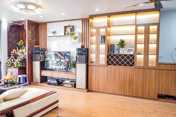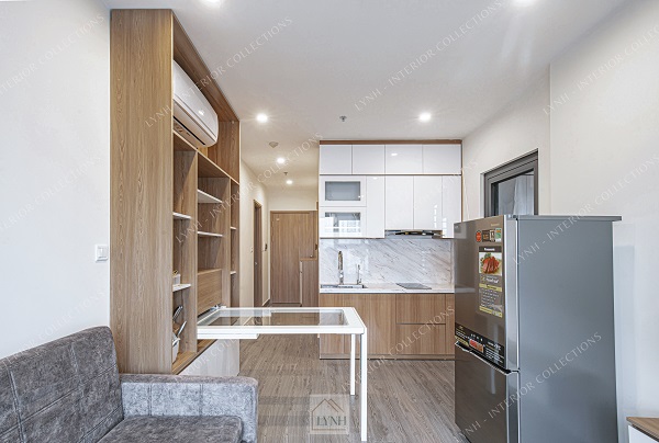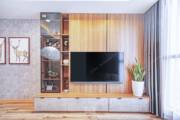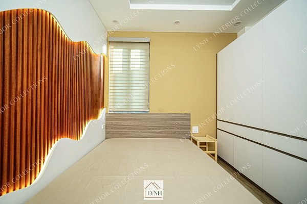 Toàn bộ nội thất căn hộ đều bằng chất liệu gỗ MDF phủ melamine khiến bất kỳ ai cũng phải mê mẩn với đường nét sang trọng và tinh tế từ vân gỗ. Bên cạnh đó, gia chủ lựa chọn sử dụng giấy dán tường tạo nên sự ấn tượng khiến người nhìn bị lôi cuốn từ ánh nhìn đầu tiên. Hơn nữa, nội thất ngôi nhà được thiết kế với những hình khối vuông vức, khiến cho không gian thêm khỏe khoắn và gọn gàng hơn.