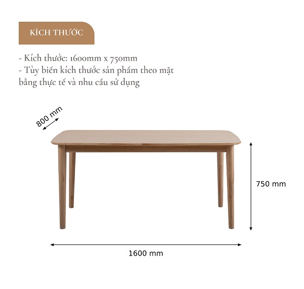 Kích thước bàn tiêu chuẩn, phù hợp với diện tích không gian