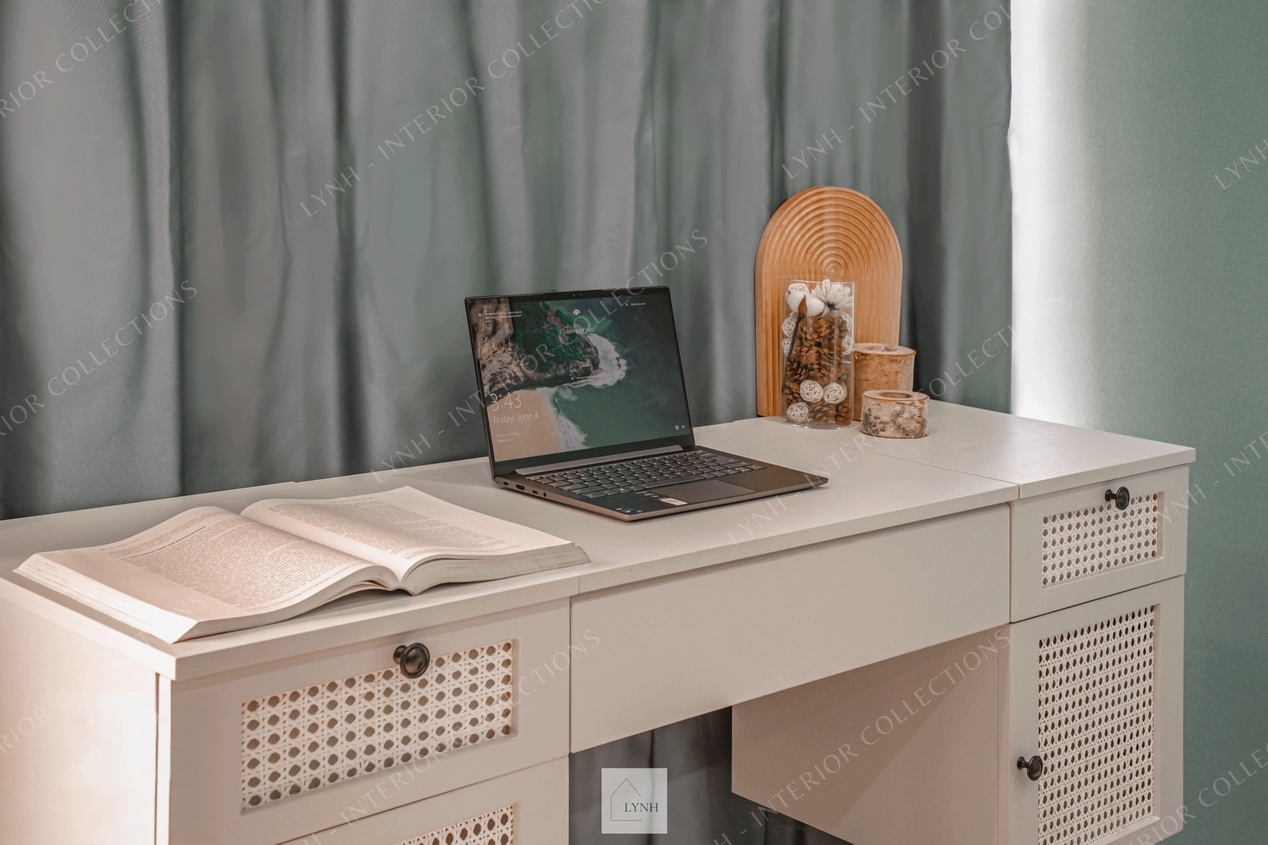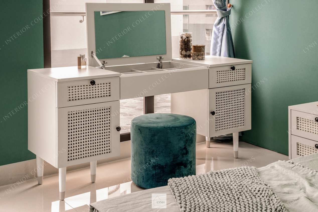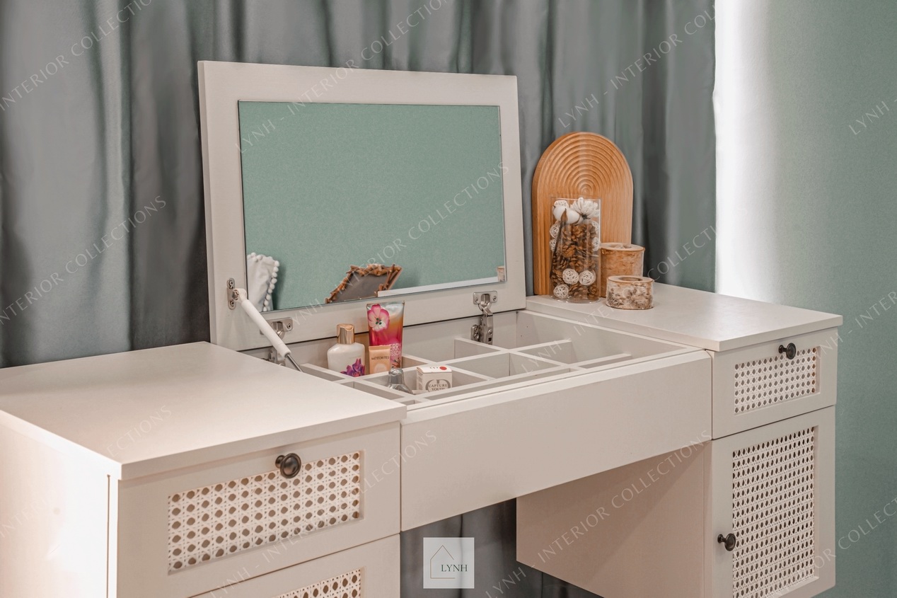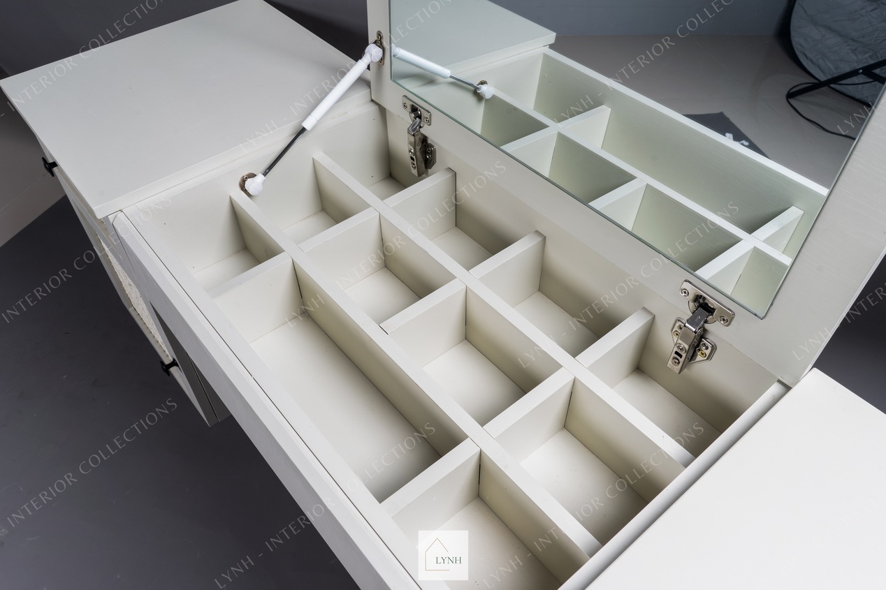 - Thiết kế bàn phấn gương gập thông minh, tích hợp giữa 2 công năng, vừa làm bàn trang điểm và vừa là bàn làm việc