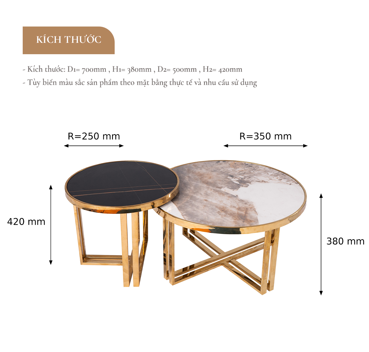 Thiết kế bàn trà mặt đá chân sắt gồm 2 bàn nhỏ: 1 bàn cao và 1 bàn thấp được xếp ghép vào nhau tạo nên một tổng thể đẹp mắt và độc đáo. Bàn trà mặt đá cao cấp mang nét đẹp tinh tế, phần chân inox hiện đại, thanh thoát, có thể kết hợp với nhiều không gian hiện đại.