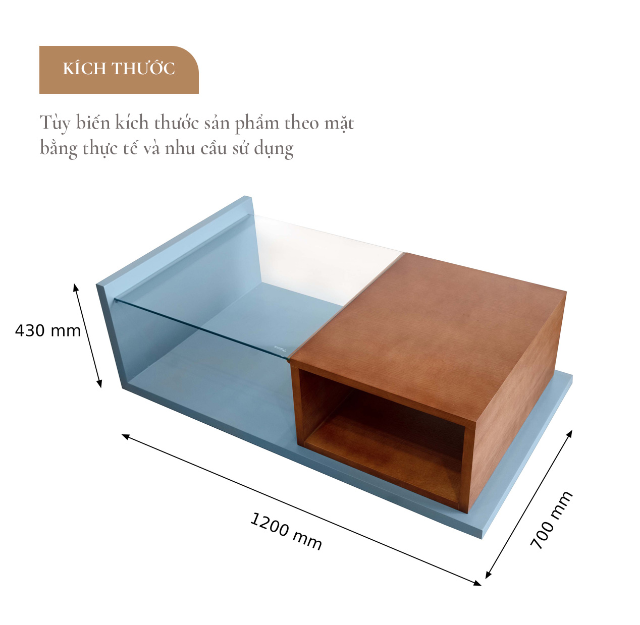 Ngoài ra, phần mặt bàn kính cường lực trong suốt tạo điểm nhấn riêng biệt cho sản phẩm. Đường nét thiết kế và màu sắc bàn trà tuy đơn giản nhưng lại vô cùng hài hòa và phù hợp với nhiều kiểu kiến trúc nhà ở.