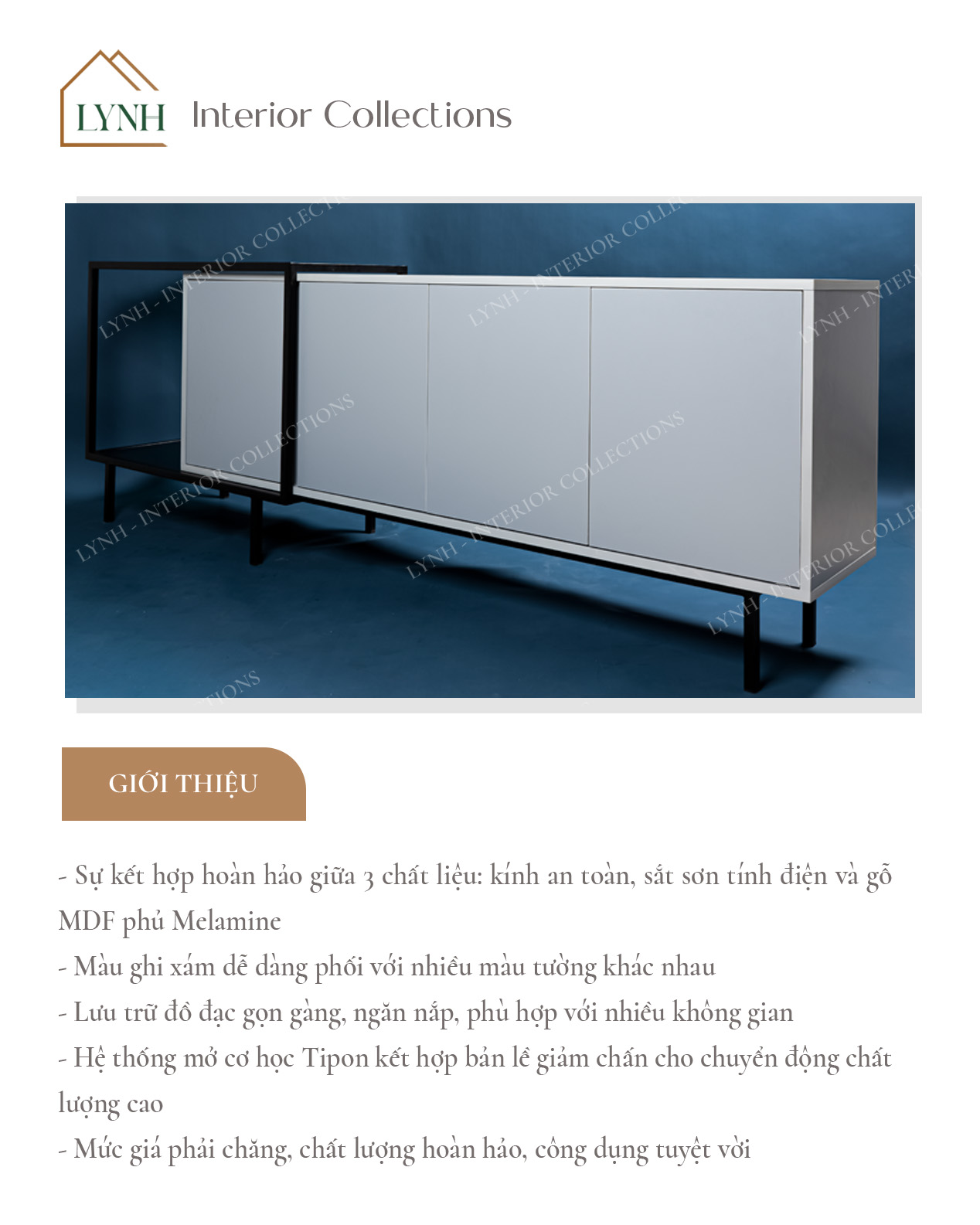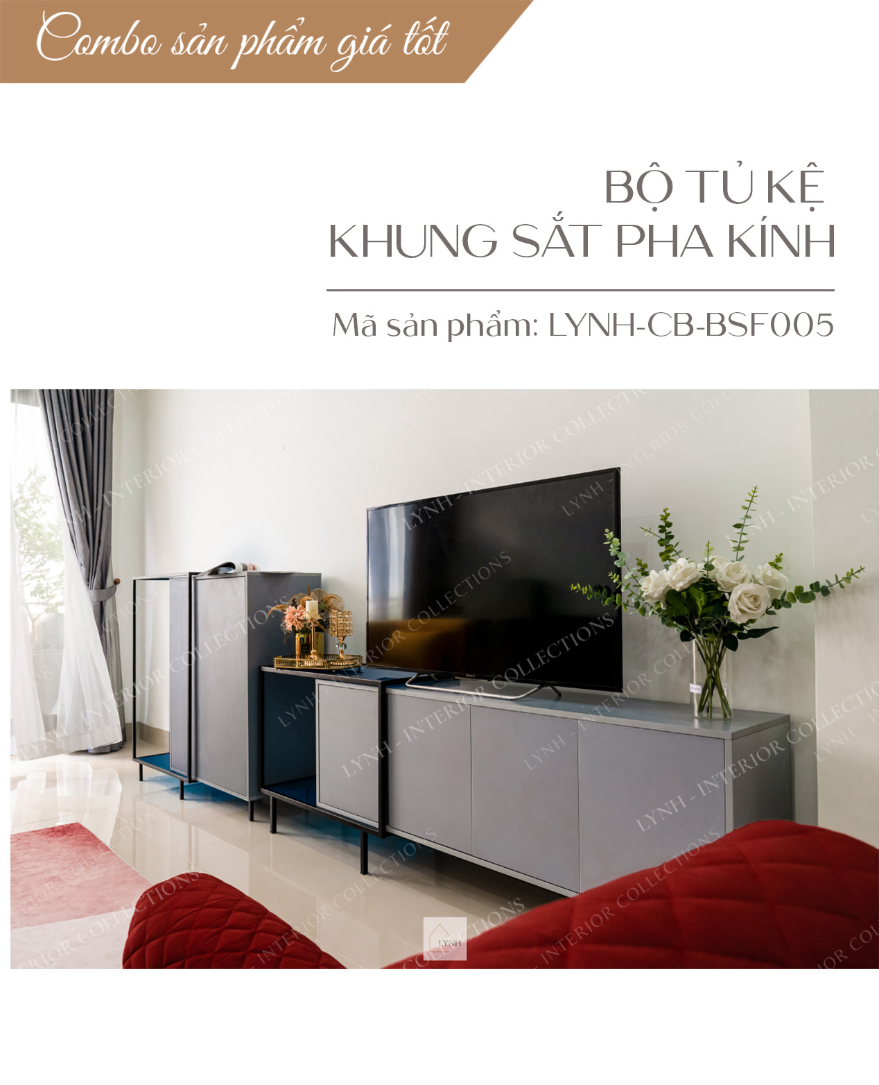 Bộ tủ kệ khung sắt trang trí pha kính tipon giúp không gian nội thất phòng khách đẹp mắt, hiện đại và có điểm nhấn ấn tượng. Ngoài ra, tủ còn thiết kế ngăn để đồ rộng rãi, giúp việc lưu trữ đồ đạc được tiện nghi hơn. Tìm hiểu bộ tủ kệ khung sắt pha kính Tipon của LYNH trong phần dưới của bài viết.