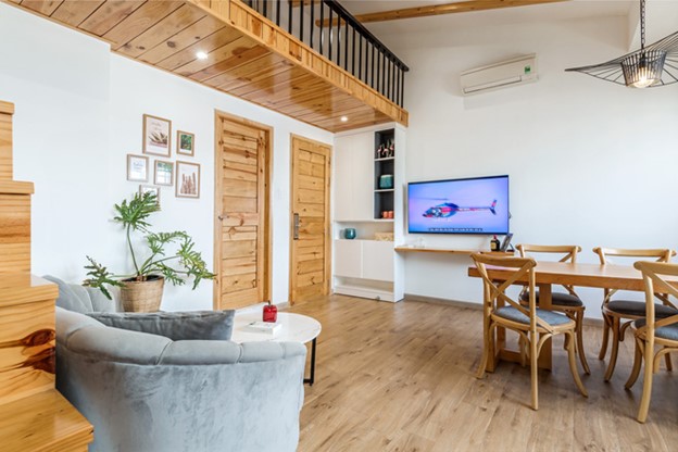 Phong cách thiết kế mang hơi hướng Đà Lạt giúp mang đến sự nhẹ nhàng, gần gũi cho không gian. Vì vậy, tone màu chủ đạo ở đây chủ yếu là trắng và gỗ thông. Vật liệu chính là gỗ thông tự nhiên kết hợp với gỗ MDF An Cường sơn trắng và xám cũng giúp căn hộ toát lên không khí mộng mơ của Đà Lạt.