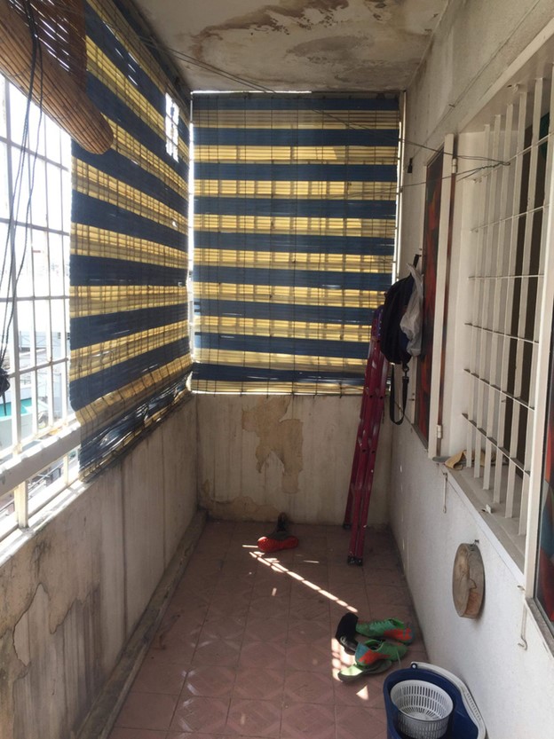 Đây là căn hộ trên tầng áp mái nên kiến trúc sư đã nâng trần cao nhất có thể để bố trí được một phòng nhỏ trên gác lửng. Bên cạnh đó, bếp được chuyển ra ngoài ban công nên nới rộng được khu phơi quần áo. Trái ngược với căn bếp chật hẹp trước đây, mọi công đoạn nấu nướng đều ở ngoài ban công nên trong nhà không bị ám mùi thức ăn. Bàn ăn cho 6 người thoải mái, phù hợp với nhu cầu của chủ nhà. Ngoài ra, nhà vệ sinh được di chuyển vào khu bếp cũ nên thiết kế được phòng tắm đứng kính, có thêm tủ lavabo đựng đồ và tủ gương.