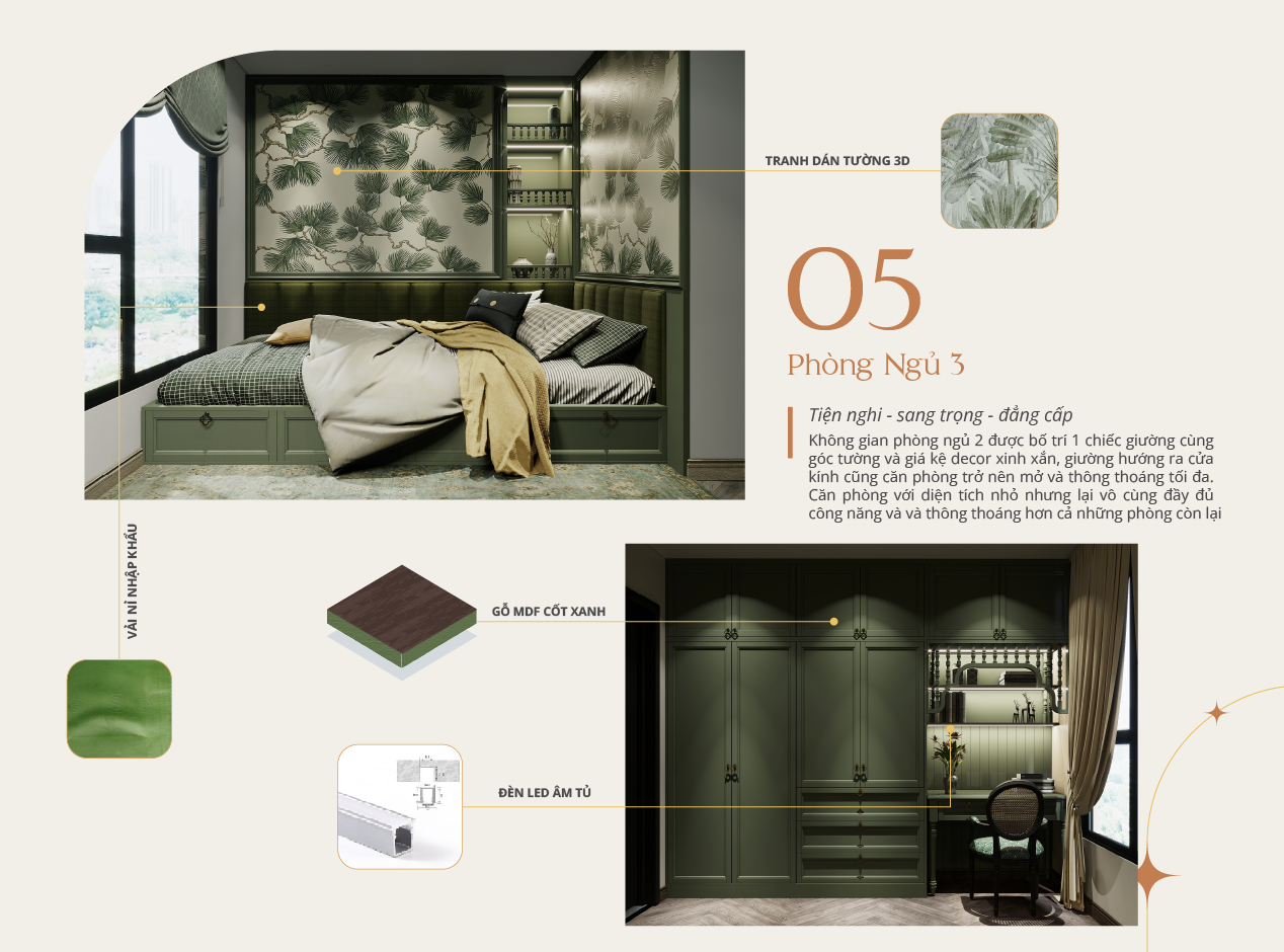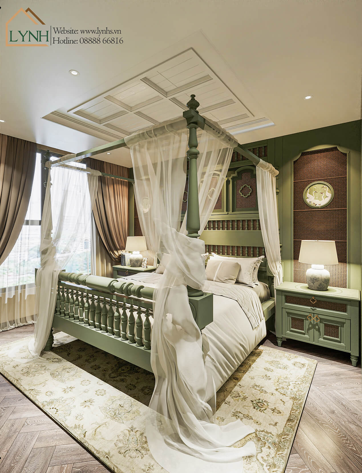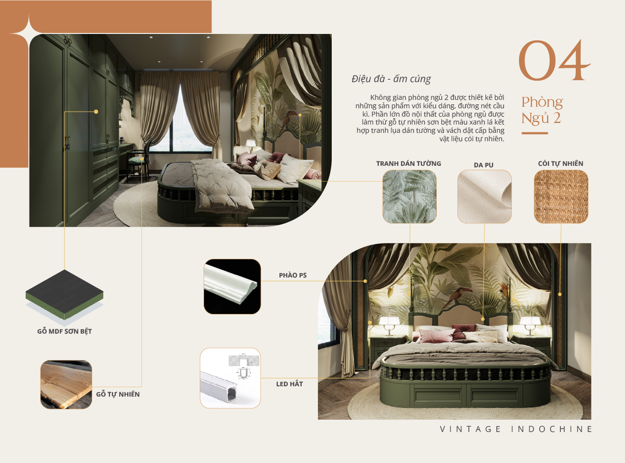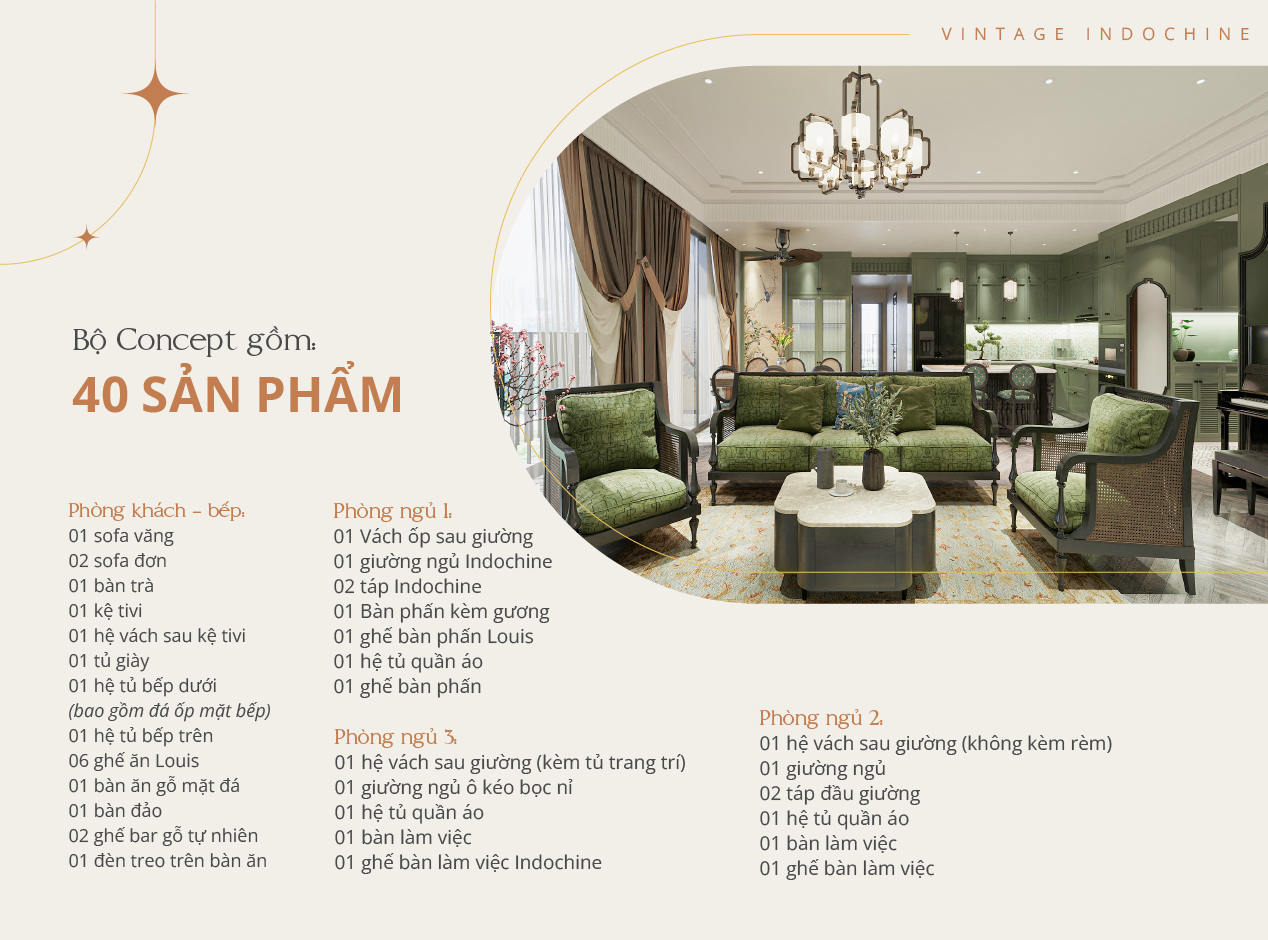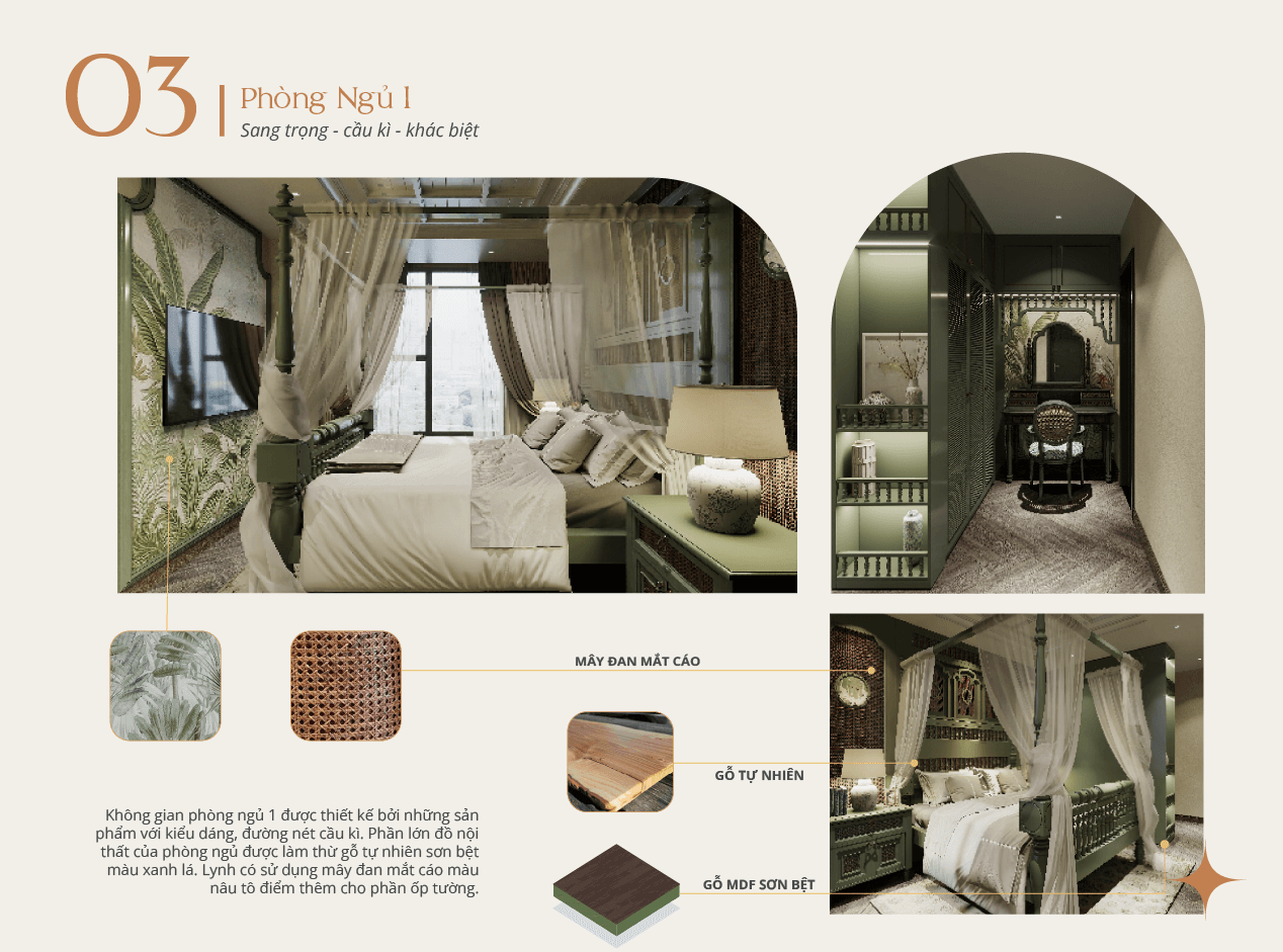 Với phong cách thiết kế này, Lynh đã đưa ra 3 căn phòng ngủ với 3 kiểu thiết kế khác nhau. Nếu như căn hộ của bạn là căn 1 phòng ngủ hoặc 2 phòng ngủ, bạn có thể tiết chế hoặc lược bỏ đồ nội thất nằm trong concept. Đơn giá của bộ Concept thiết kế Indochine được thay đổi tùy theo kích thước, và số lượng đồ mà chủ nhà lựa chọn hoàn thiện.