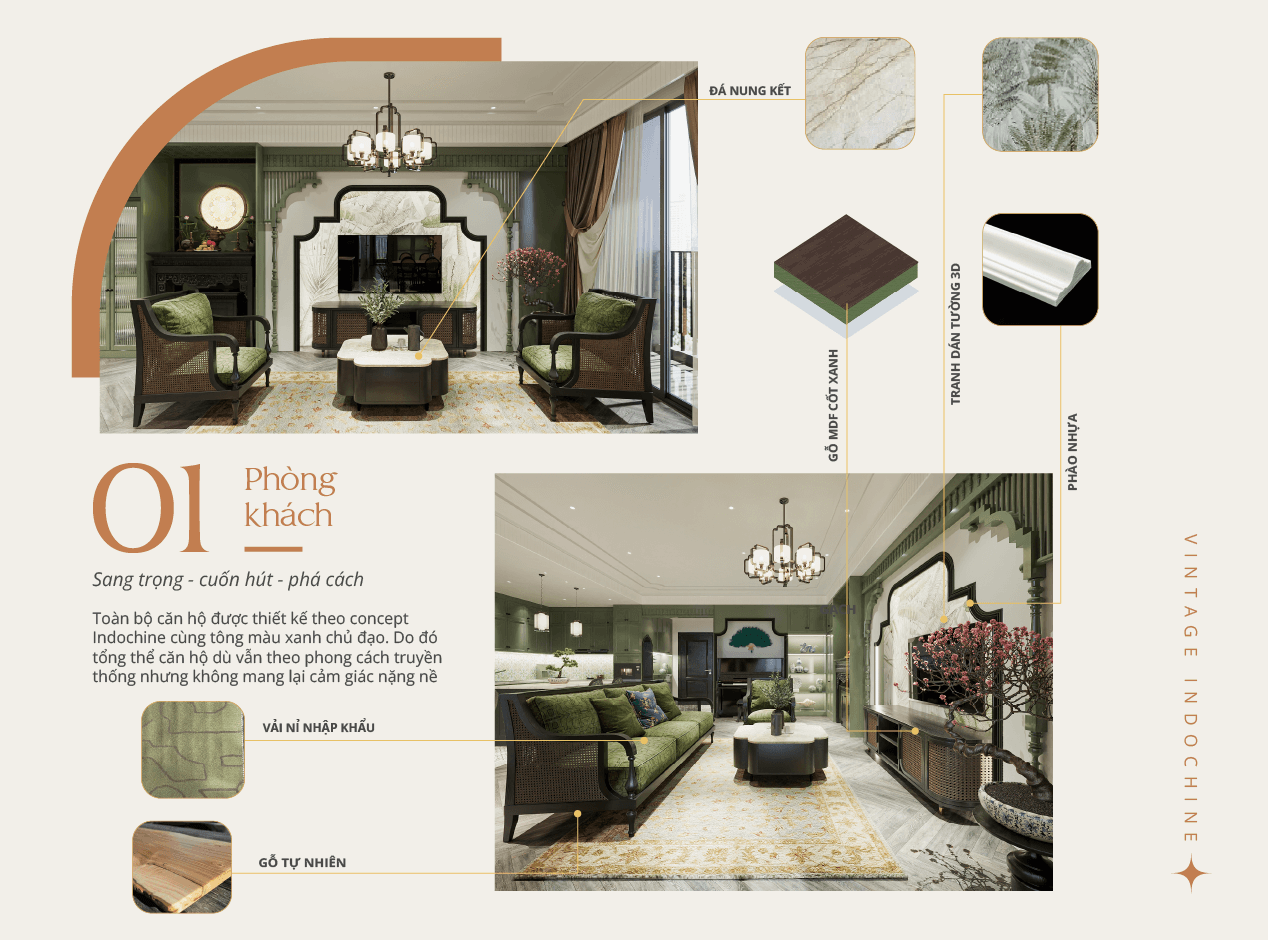 Vật liệu mây đan cói lần đầu được ứng dụng vào thiết kế Indochine, Lynh đã cố gắng phát huy và phát triển các vật liệu truyền thống của Việt Nam vào trong thiết kế Đông Dương của mình. Việt tận dụng tối đa vật liệu truyền thống sẽ giúp việc sáng tạo về màu sắc và kiểu dáng ko bị cách xa văn hóa truyền thống được thổi vào căn hộ này.