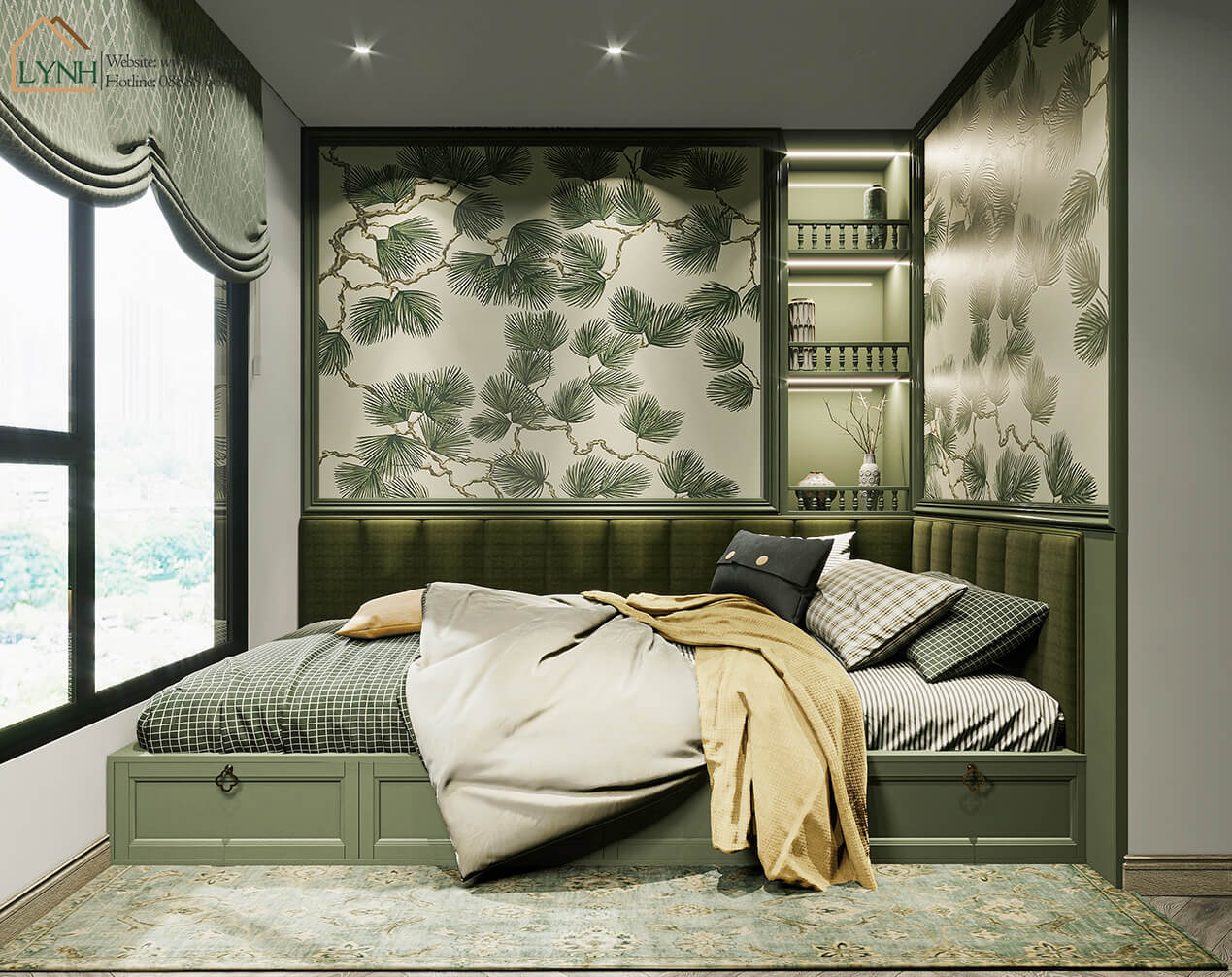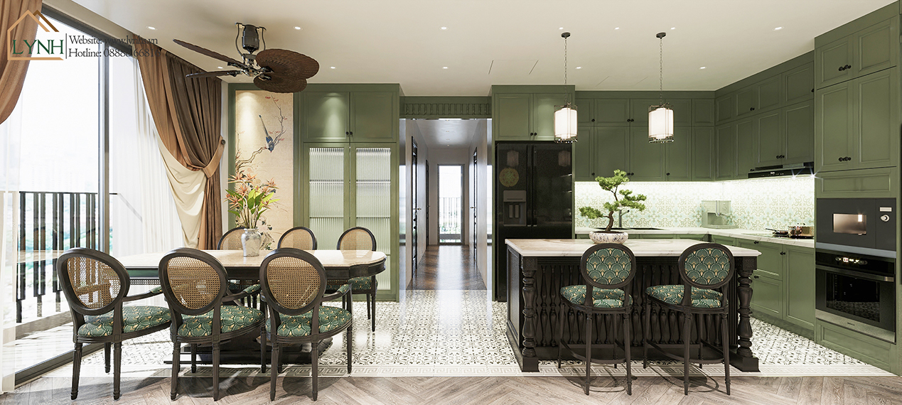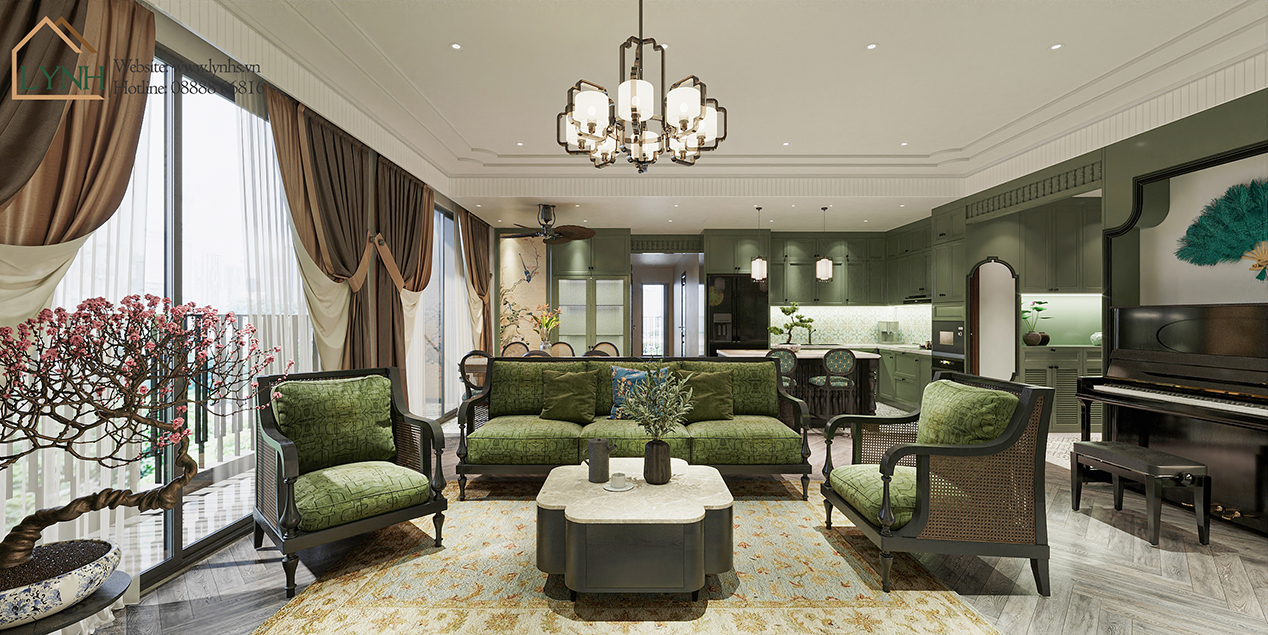 Phần lớn các căn hộ được thiết kế theo phong cách Indochine đều mang gam màu đen hoặc nâu làm chủ đạo. Những gam màu tối này sẽ có thiên hướng phù hợp với những căn nhà rộng, thoáng, nhiều cửa sổ như dạng Villa, Biệt thự, Nhà phố...; còn những căn nhà chung cư bị giới hạn diện tích sẽ rất dễ trở nên bí bách và nặng nề khi dùng gam màu tối này. Do đó, Lynhs đã mang đến một làn gió mới cho phong cách này cho căn hộ chung cư bằng gam màu xanh dịu mắt - đây cũng là gam màu mang đến sự thư giãn, tĩnh lặng cho gia chủ sau những ngày làm việc mệt mỏi bên ngoài.