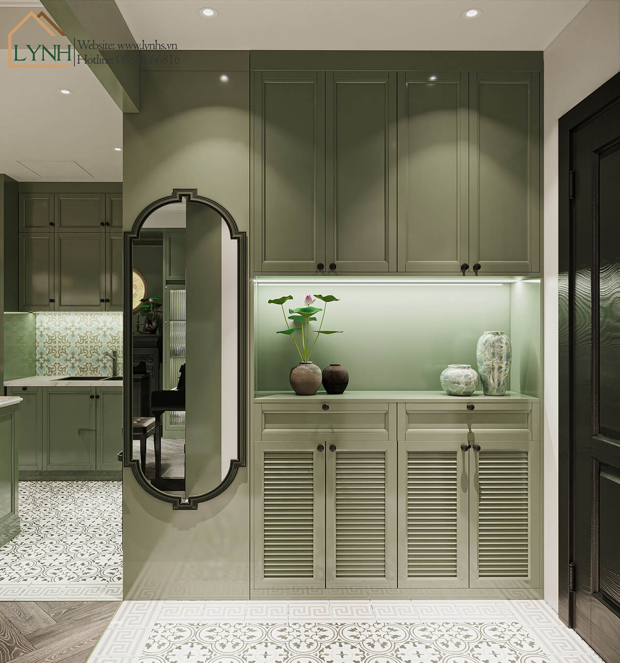 Khu vực sảnh đón khách được Lynh thiết kế với nền gạch bông cùng hệ tủ cánh chớp để đồ. Phần cánh chớp là nét đặc trưng rất riêng của phong cách nội thất Đông Dương Indochine. Ưu điểm của hệ cánh này chính là giúp cho khoang tủ bên trong trở nên thông thoáng, đặc biệt là khu vực tủ giày. Nhờ đó mà bên trong khoang tủ sẽ hạn chế đi phần ẩm mốc.