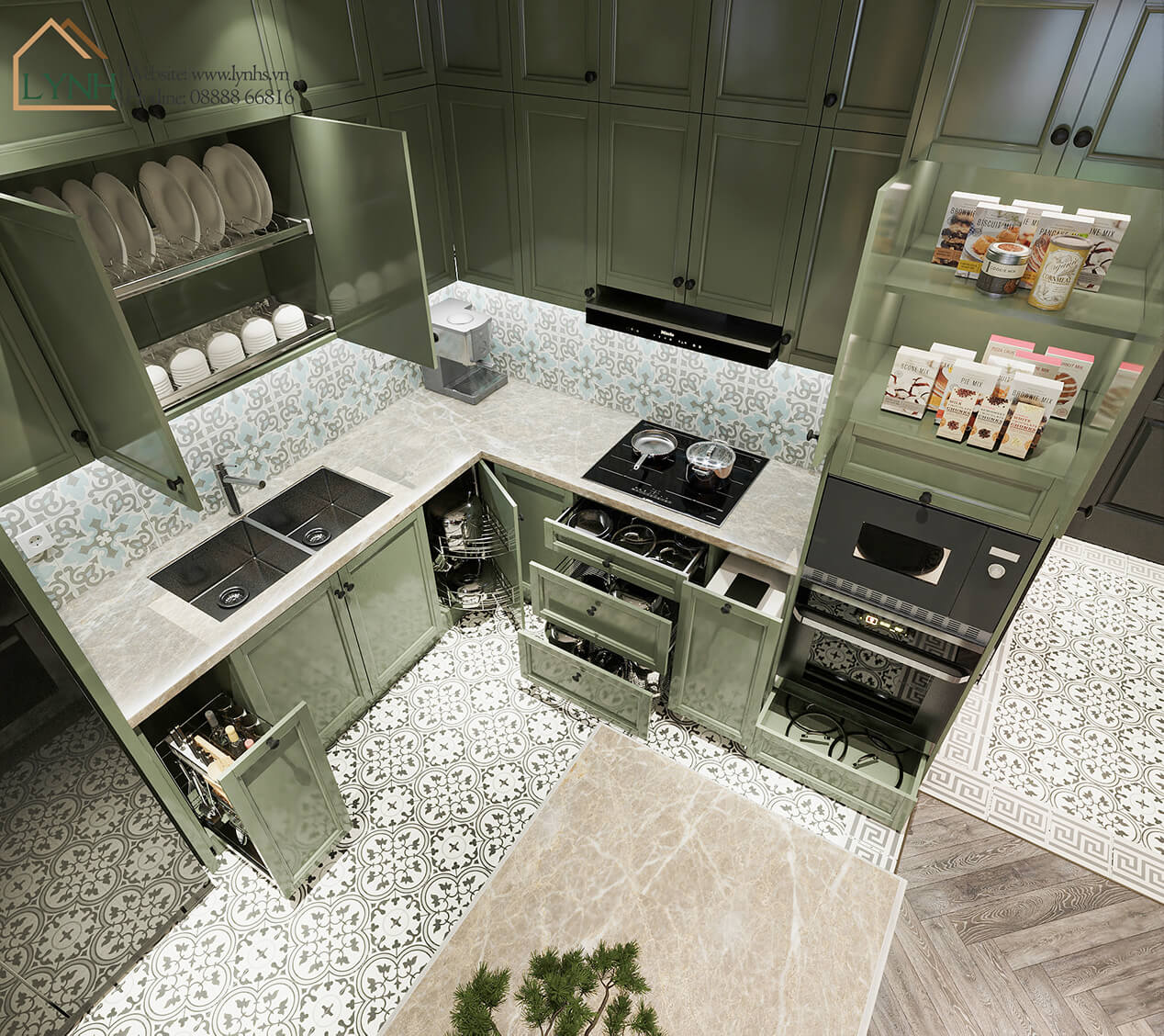 Tiếp nối với không gian phòng khách chính là khu vực bếp được thiết kế hệ bàn đảo và bàn ăn khá rộng, phù hợp với gia đình đông người hoặc có 3 thế hệ. Gam màu của không gian này được thiết kế tương tự với phòng khách với tâm điểm là màu đen và toàn bộ hệ tủ liền tường được thiết kế với am màu xanh lá.