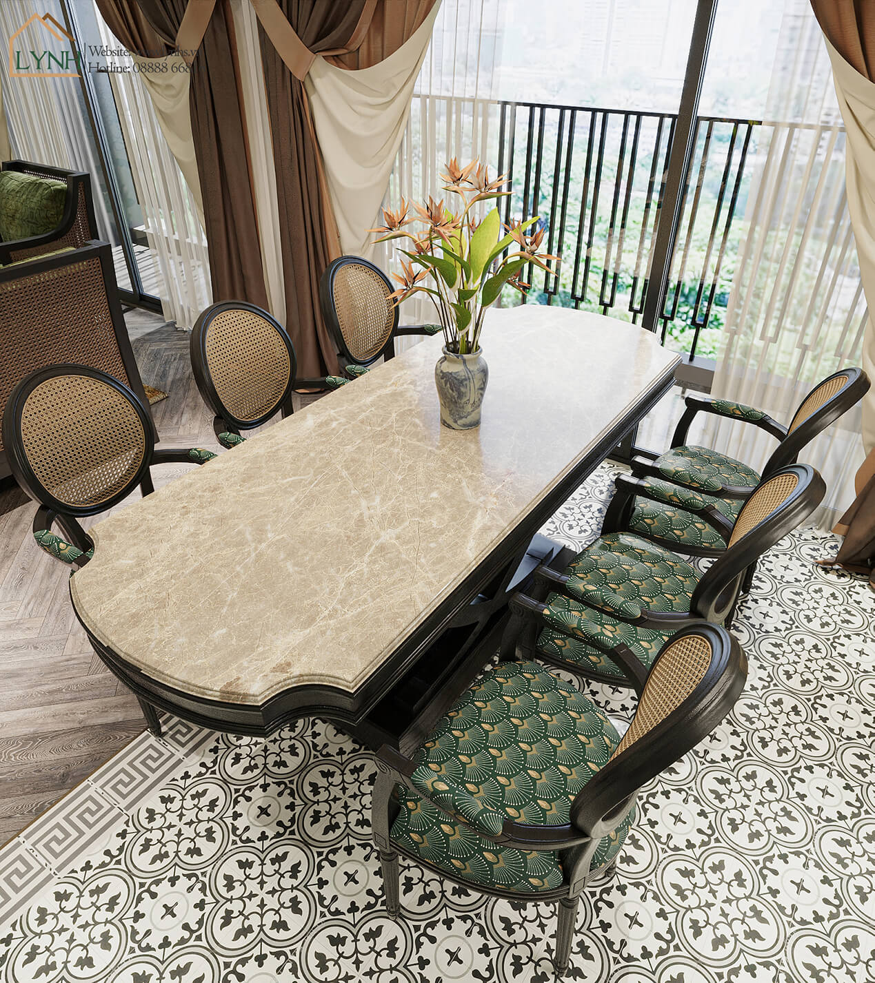Phần ghế ăn được kết hợp tựa lưng mây và 2 tay ghế bọc nỉ hoa văn Indochine, các khách hàng có thể điều chỉnh kích thước bà ăn và chi tiết nhỏ của ghế dựa theo nhu cầu sử dụng của gia đình.