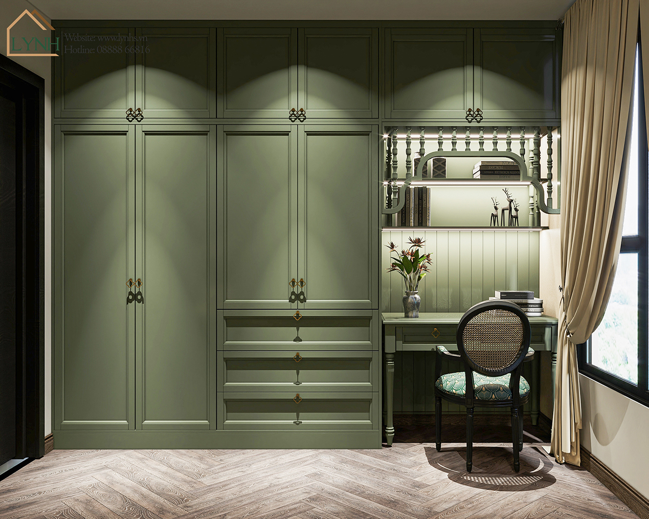 Khu vực tủ áo và làm việc được bố trí tách biệt với giường ngủ. Lynh không khuyến khích bố trí các hệ tủ lớn ở quanh giường, bởi thiết kế đó mang lại phong thủy không tốt cho khu vực nghỉ ngơi. Nỉ ốp tường được thi công độc lập, không liền mạch với giường để đảm bảo chi phí không bị phát sinh nhiều, cũng như dễ dàng trong việc sửa chữa, bảo hành.