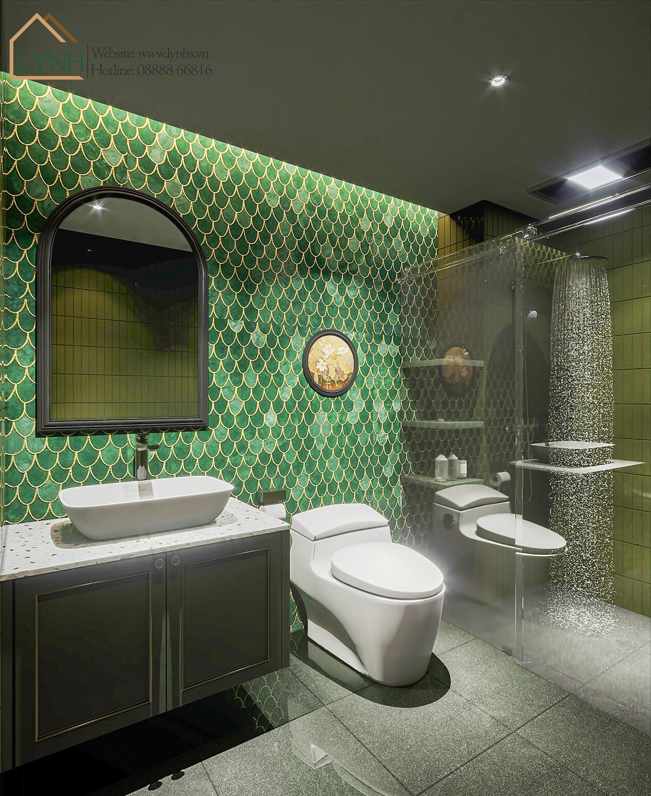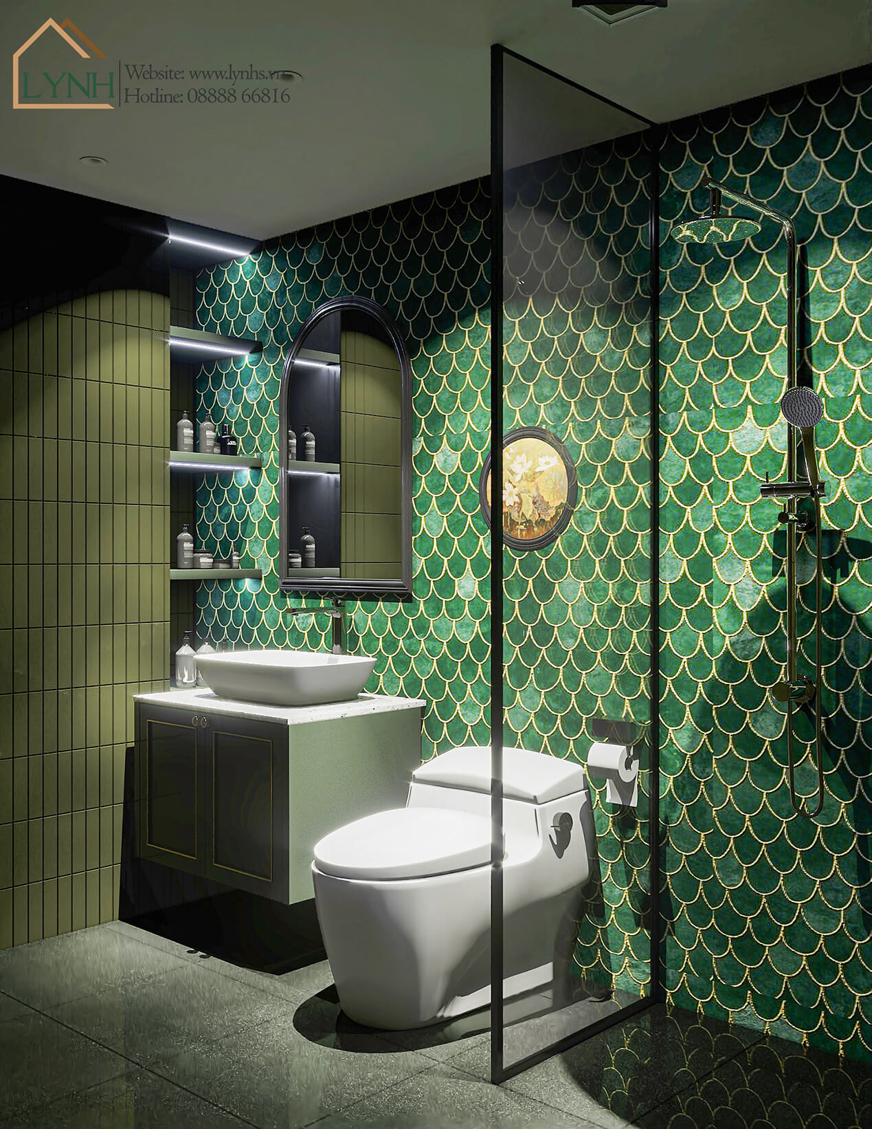 Đối với những chủ nhà có nhu cầu cải tạo lại khu vực vệ sinh để có những thiết kế ăn nhập và công năng sử dụng theo nhu cầu riêng thì 2 phòng vệ sinh dưới đây đi theo thiết kế căn hộ là phương án không thể bỏ qua. Lynh đã xử lý lại phần ốp lát khu vực tường bằng gạch bông mosaic , và kết hợp thêm hệ tủ lavabo màu xanh lá. Tuy nhiên Lynh tư vấn bạn nên giữ nguyên phần nền của nhà vệ sinh để đảm bảo chất lượng chống thấm của căn hộ.