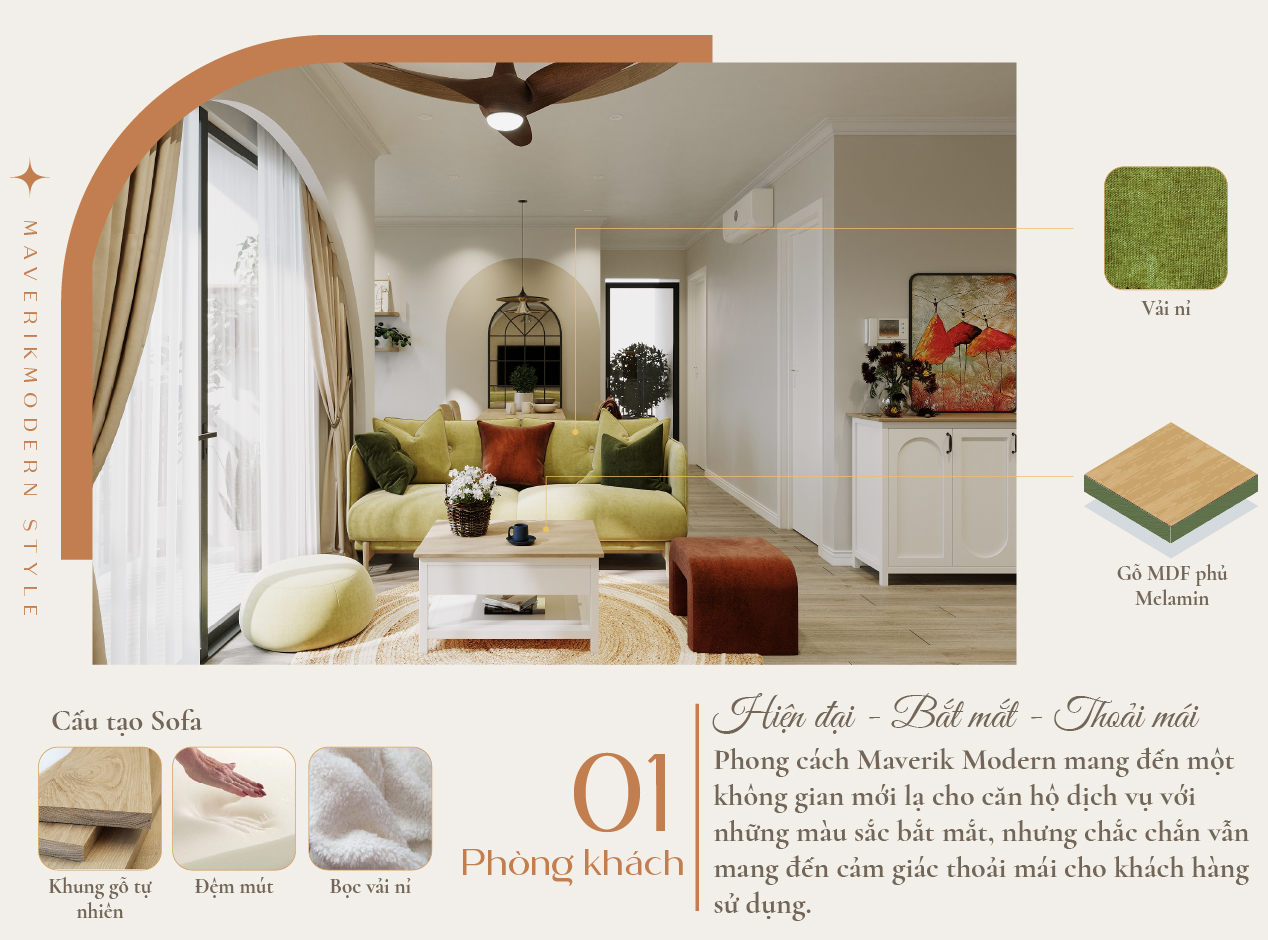 Concept Maverick Modern với thiết kế độc đáo và những món đồ nội thất có một không hai. Điểm nhấn trong không gian này nằm ở sự kết hợp màu sắc một cách ngẫu nhiên, cùng với những mảnh ghép chồng chéo, sinh động. Đây là phong cách hiện đại mà lại cực kỳ sáng tạo và lý tưởng dành cho các căn hộ dịch vụ.