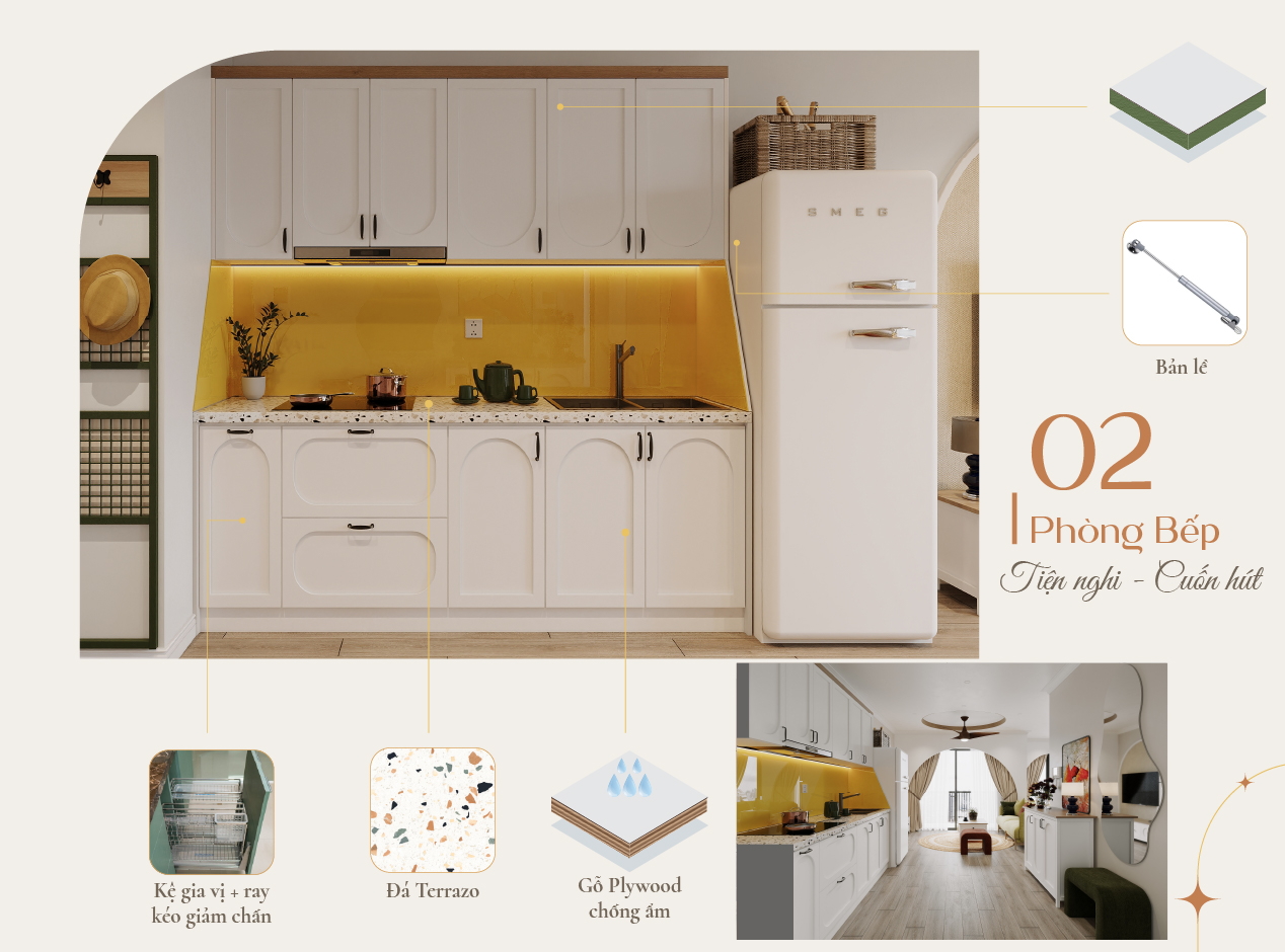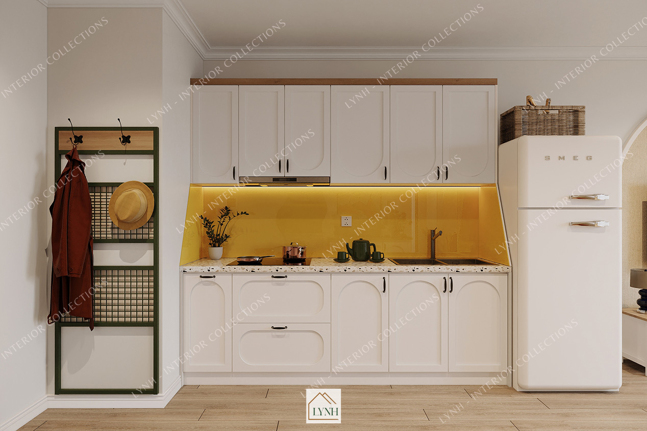 Bố cục, cách sắp xếp và phối màu được sử dụng phù hợp cho không gian bếp