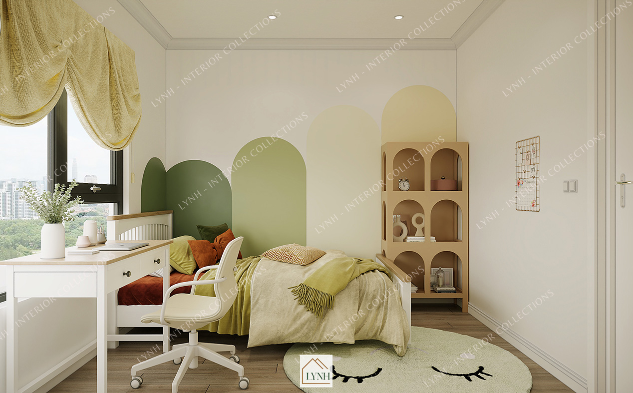 Màu sắc sử dụng cho không gian này là những gam màu rực rỡ, không những mang đến sự mới mẻ mà còn tạo cảm giác ấm áp và vui vẻ.