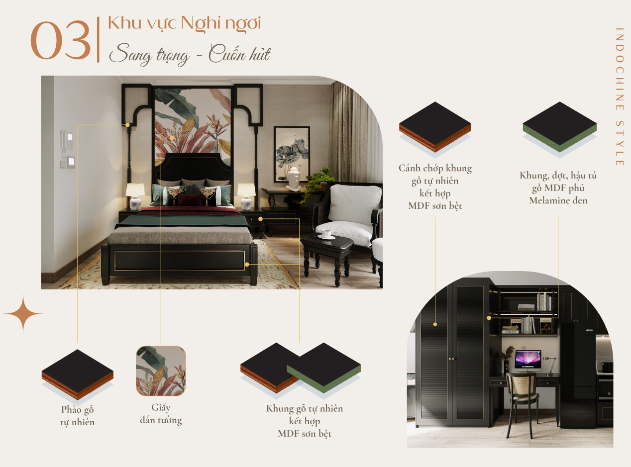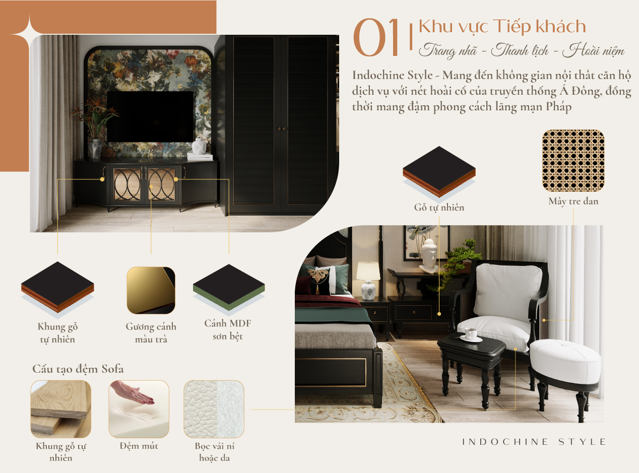 Là sự kết hợp đầy tinh tế, xóa bỏ đi ranh giới giữa Á và Âu, tạo nên vẻ đẹp ấm cúng nhưng không kém phần sang trọng và hiện đại. Concept phong cách Indochine trở thành sự lựa chọn của nhiều chủ đầu tư căn hộ dịch vụ.