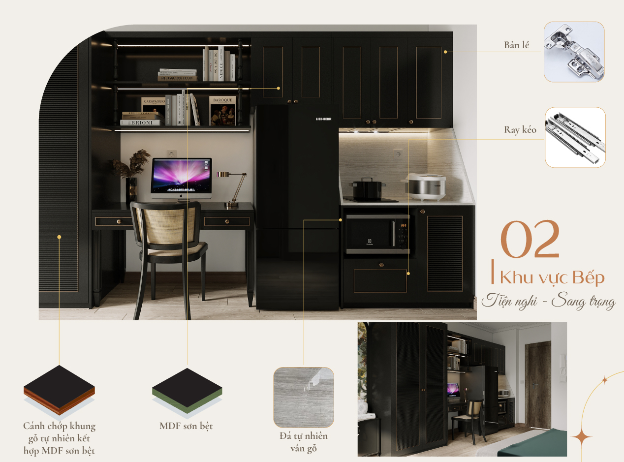Hệ tủ bếp được thiết kế với kích thước phù hợp với diện tích không gian để đảm bảo sự cân đối giữa các khu vực trong căn hộ. Với chất liệu, Nội thất Lynh sử dụng gỗ MDF sơn bệt màu đen cho tủ bếp nhằm tiết kiệm chi phí đầu tư nhưng vẫn đảm bảo tính thẩm mỹ và yếu tố Indochine.