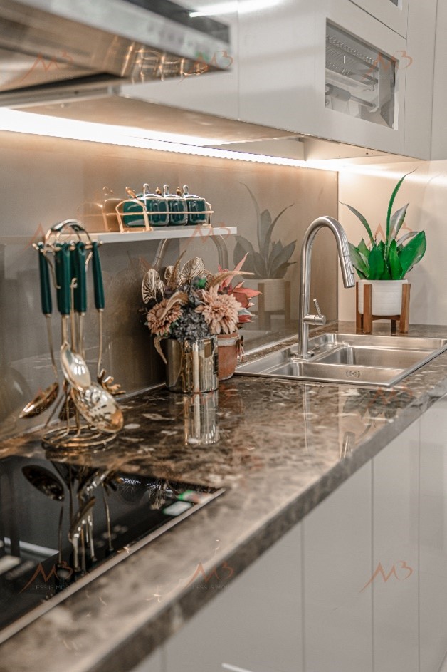Kính ốp bếp thường phù hợp với những căn bếp hiện đại, trẻ trung, đơn giản. Khi phối hợp cùng đèn led tủ, kính bếp sẽ trở nên sang trọng vào ấn tượng hơn.