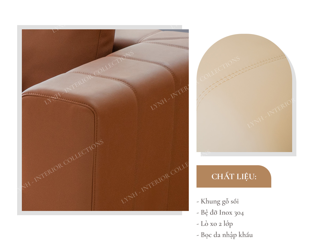 Sở hữu phần khung gỗ sồi tự nhiên chắc chắn, kết hợp với bệ đỡ inox 304, đảm bảo sự an toàn và yên tâm cho người ngồi. Đệm lò xo 2 lớp cho trải nghiệm ngồi êm ái, thoải mái và thư giãn sau ngày dài mệt mỏi.