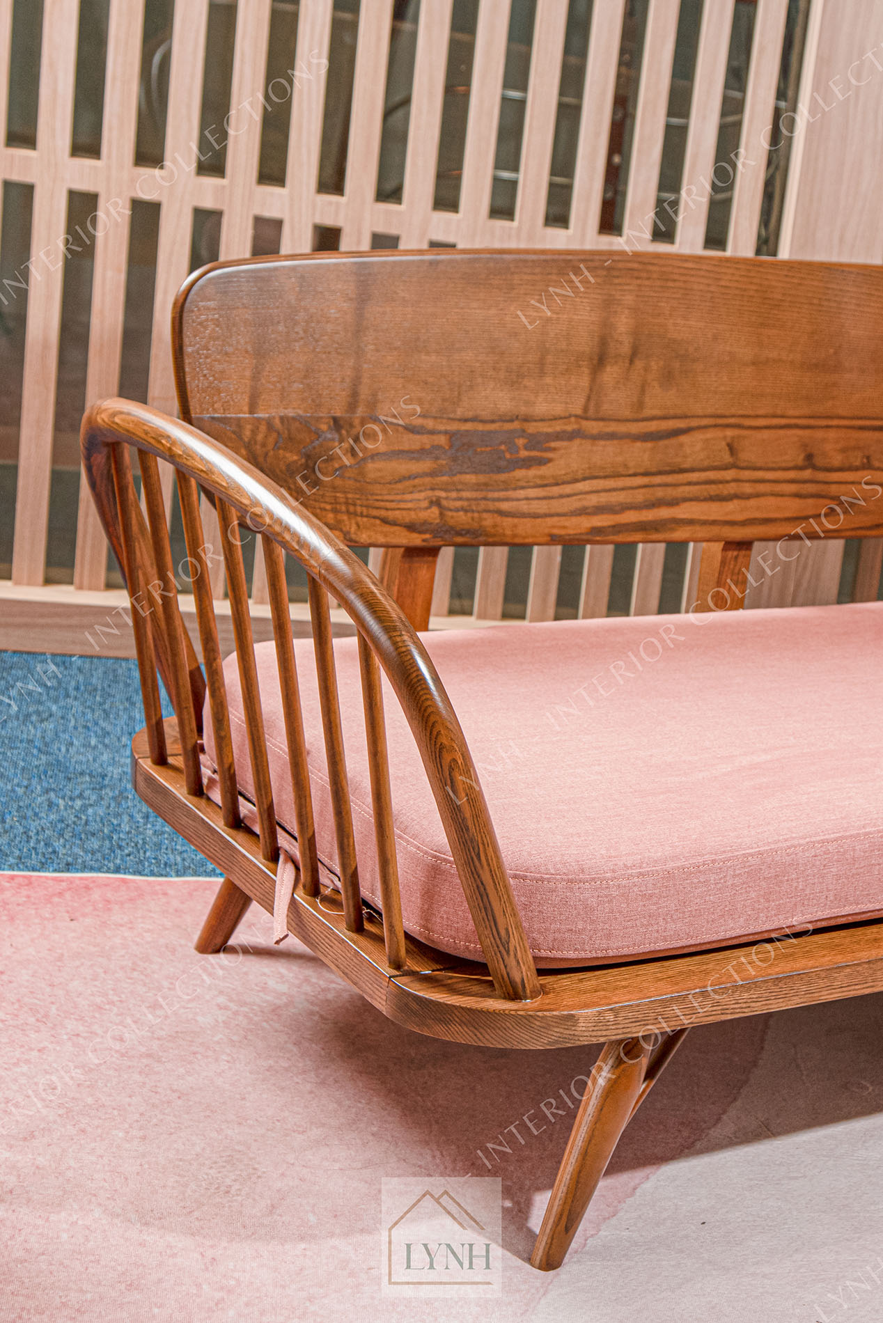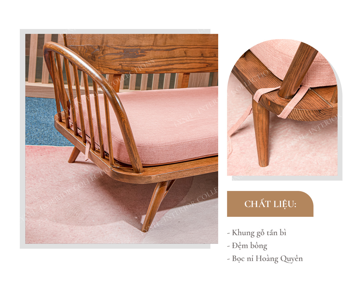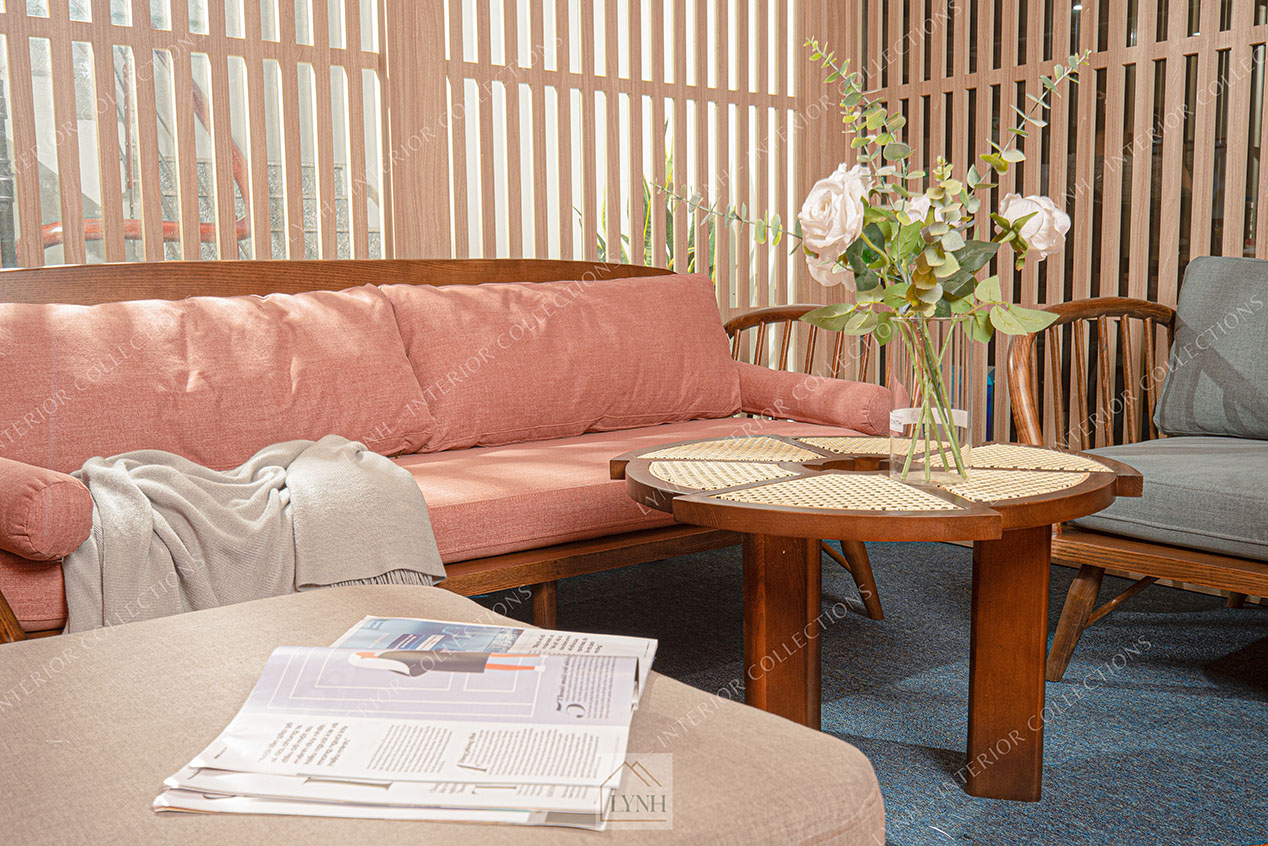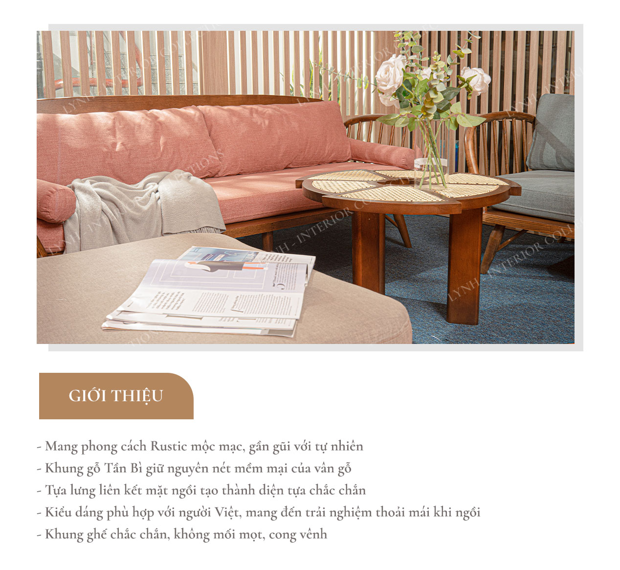 Sản phẩm sở hữu những đường nét cong mềm mại, kết hợp với phần tựa lưng nan gỗ song song. Việc sử dụng các nan gỗ cho sofa phòng khách vừa mang lại sự chắn chắn vừa khiến không gian trở nên thoáng đãng hơn thay vì những thiết kế thành khối lớn.