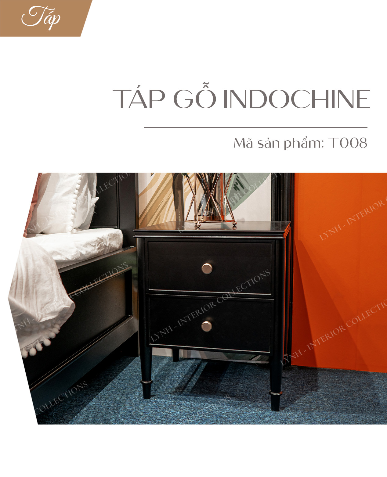 Táp đầu giường phong cách Indochine sở hữu thiết kế hiện đại với 2 ngăn kéo, cho không gian lưu trữ thoải mái. Sản phẩm mang đến cho không gian thêm chức năng sử dụng nhưng vẫn không mất đi phong cách tổng thể.