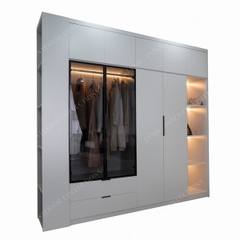 Nhiều thiết kế tủ quần áo hiện đại bằng gỗ sẽ được gắn gương trên cánh tủ, vừa tạo được điểm nhấn cho sản phẩm, vừa tăng thêm nét đẹp sang trọng cho không gian. Hoặc bạn cũng có thể tích hợp thêm phần tủ kệ trang trí để có thêm không gian bày túi xách.